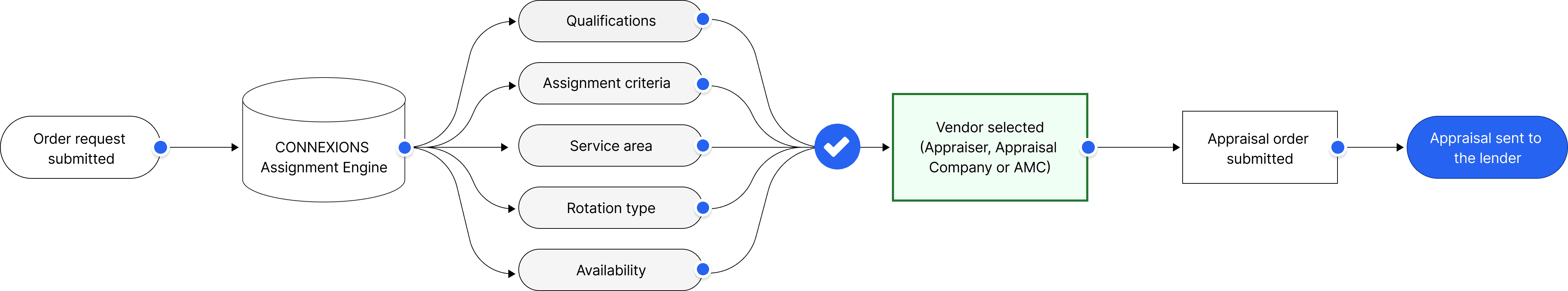 The Connexions Assignment Engine is designed to streamline the appraisal assignment process, making it faster, smarter, and more efficient. It leverages advanced algorithms and real-time data to match appraisal orders with the most qualified appraisers in a network based on custom criteria. This automated process ensures that every assignment goes to the right appraiser with the right qualifications and availability, significantly reducing the risk of delays or errors.